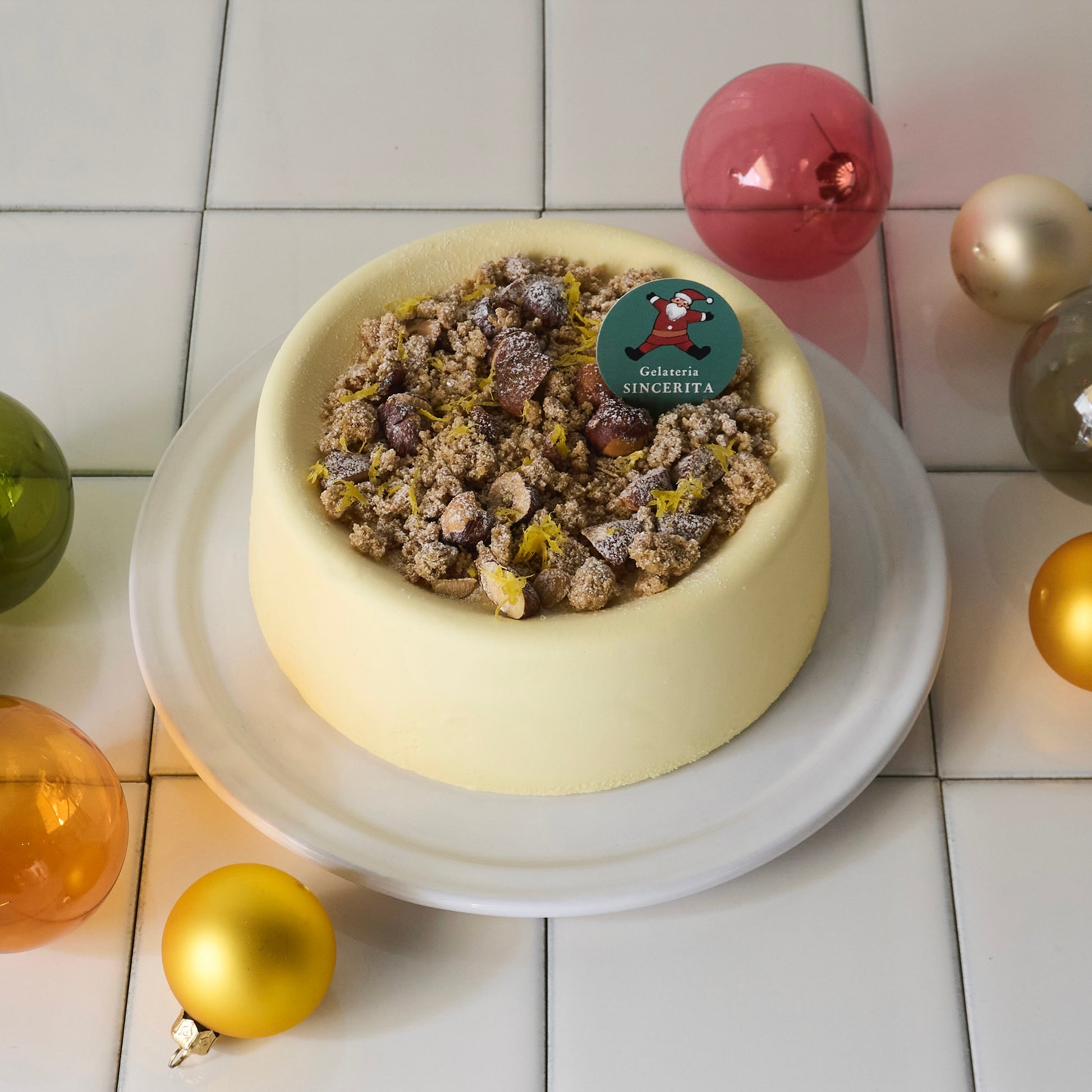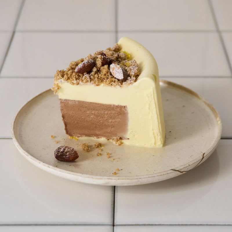 サフラン※がふわっと香るレモンミルクジェラートの中には、シトラスで香り付けしたプラリネ(アーモンドとヘーゼルナッツ、カカオ)のジェラート。上にはコーングリッツを使った焼き菓子とナッツ、レモンゼスト。