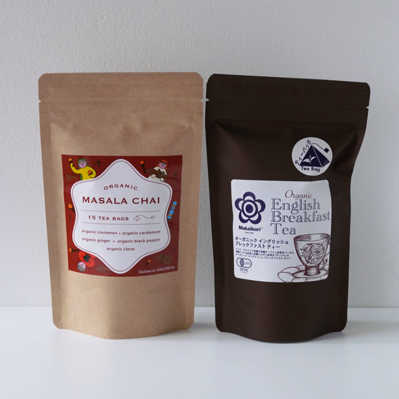 オーガニックのアッサムCTC茶葉に、シナモンやカルダモンなどのオーガニックスパイス5種を配合。ジェラートの原材料にも使用しています。