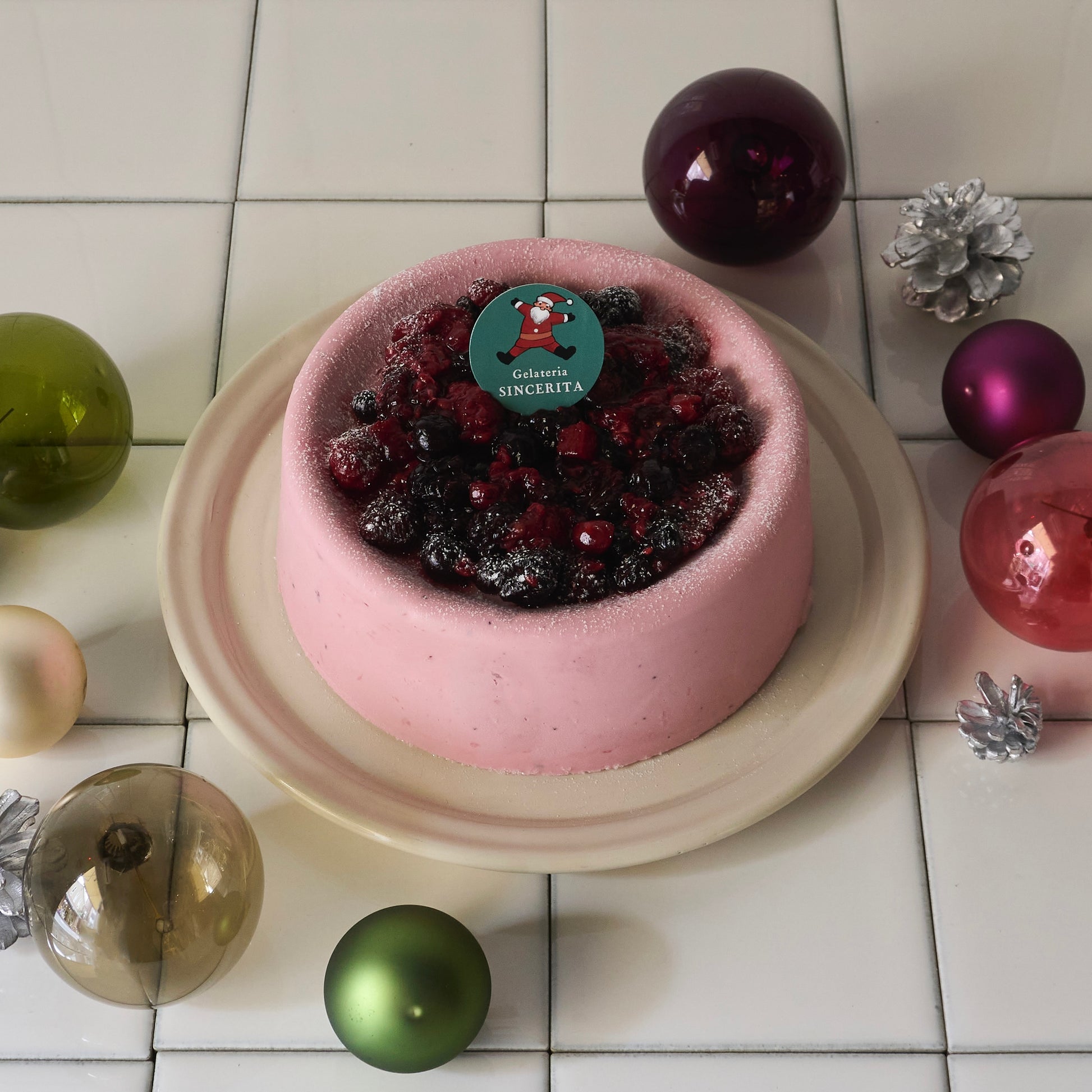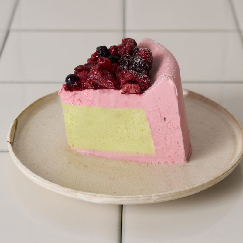 甘酸っぱいラズベリーミルクジェラートの中には、ほのかに杏仁※の香りを付けたシチリア、ブロンテ産ピスタチオのジェラートを贅沢に。上には、5種の鮮やかなベリーを敷きつめて。